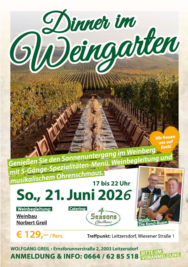 Freuen Sie sich auf das nächste Dinner im Weingarten am Sonntag, 21. Juni 2026. Genießen Sie einen Sommerabend voller kulinarischer Highlights, stimmungsvoller Live-Musik und einzigartiger Atmosphäre zwischen den Reben.